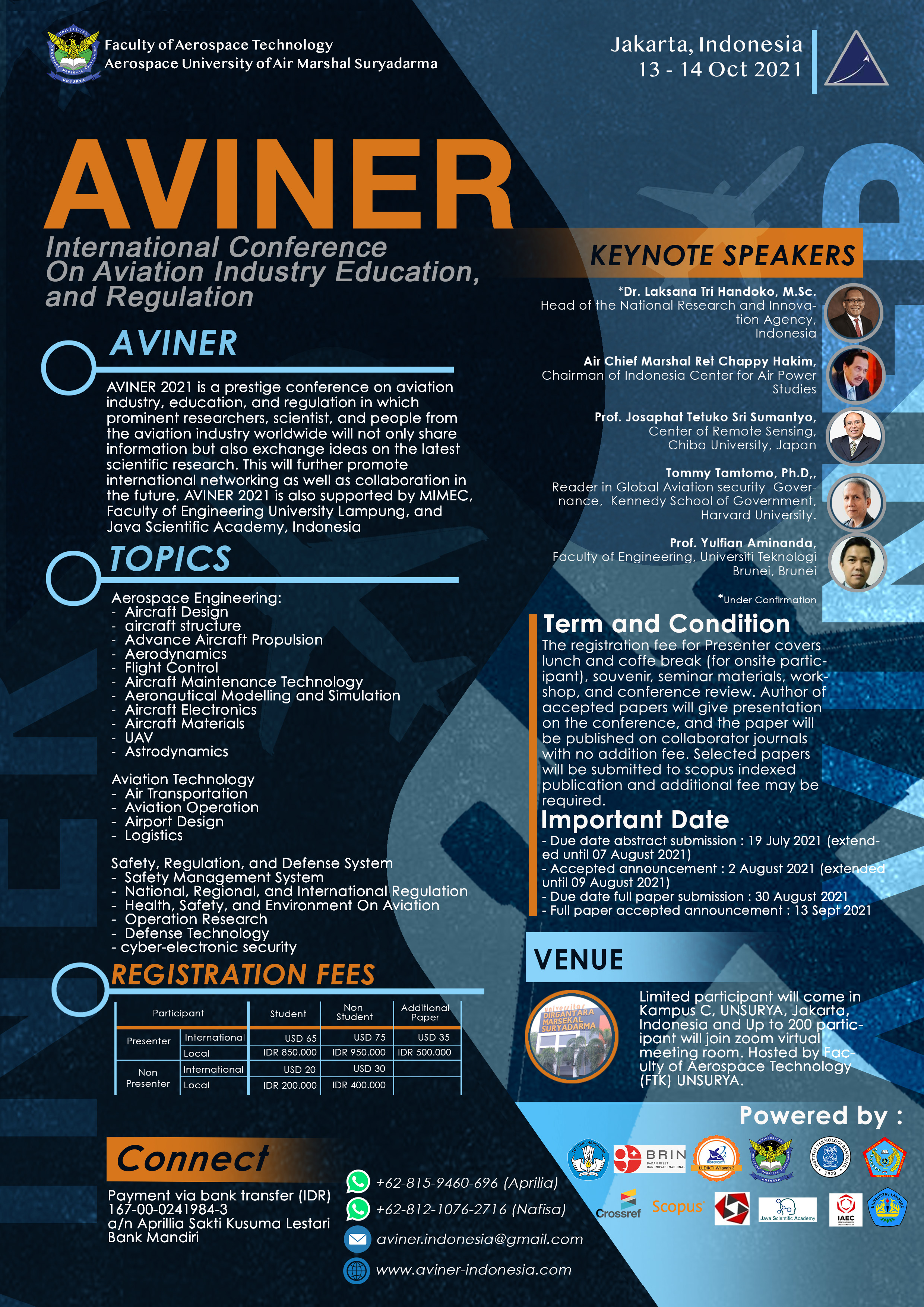 AVINER 2021 is a prestige conference on aviation industry, education, and regulation in which prominent researchers, scientist, and people from the aviation industry worldwide will not only share information but also exchange ideas on the latest scientific research. This will further promote international networking as well as collaboration in the future. AVINER 2021 is also supported by MIMEC, Faculty of Engineering University Lampung, and Java Scientific Academy, Indonesia