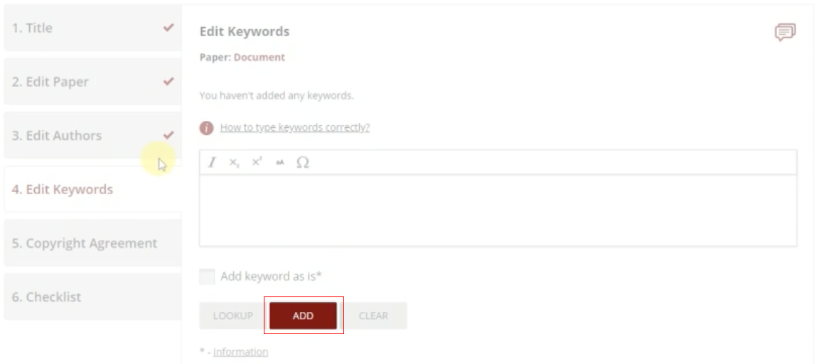 Add your paper's keyword by clicking Add button after write it in the box. Use the toolbar to