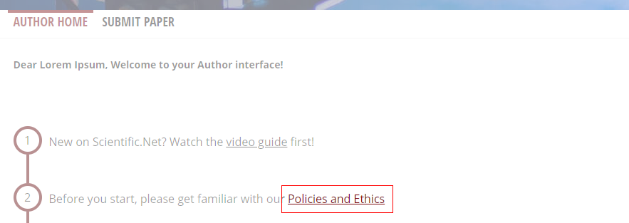 Click Policies and Ethics under the Author home tab to view the Trans Tech Publications Ltd.'