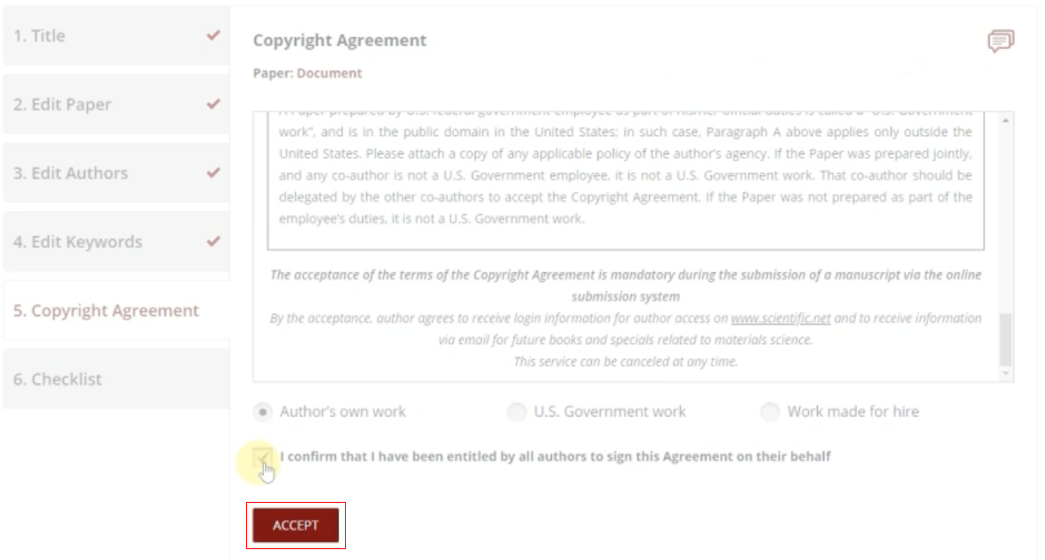 Read the copyright agreement carefully. Select radio button on "Author's own work", tick the box "I confirm